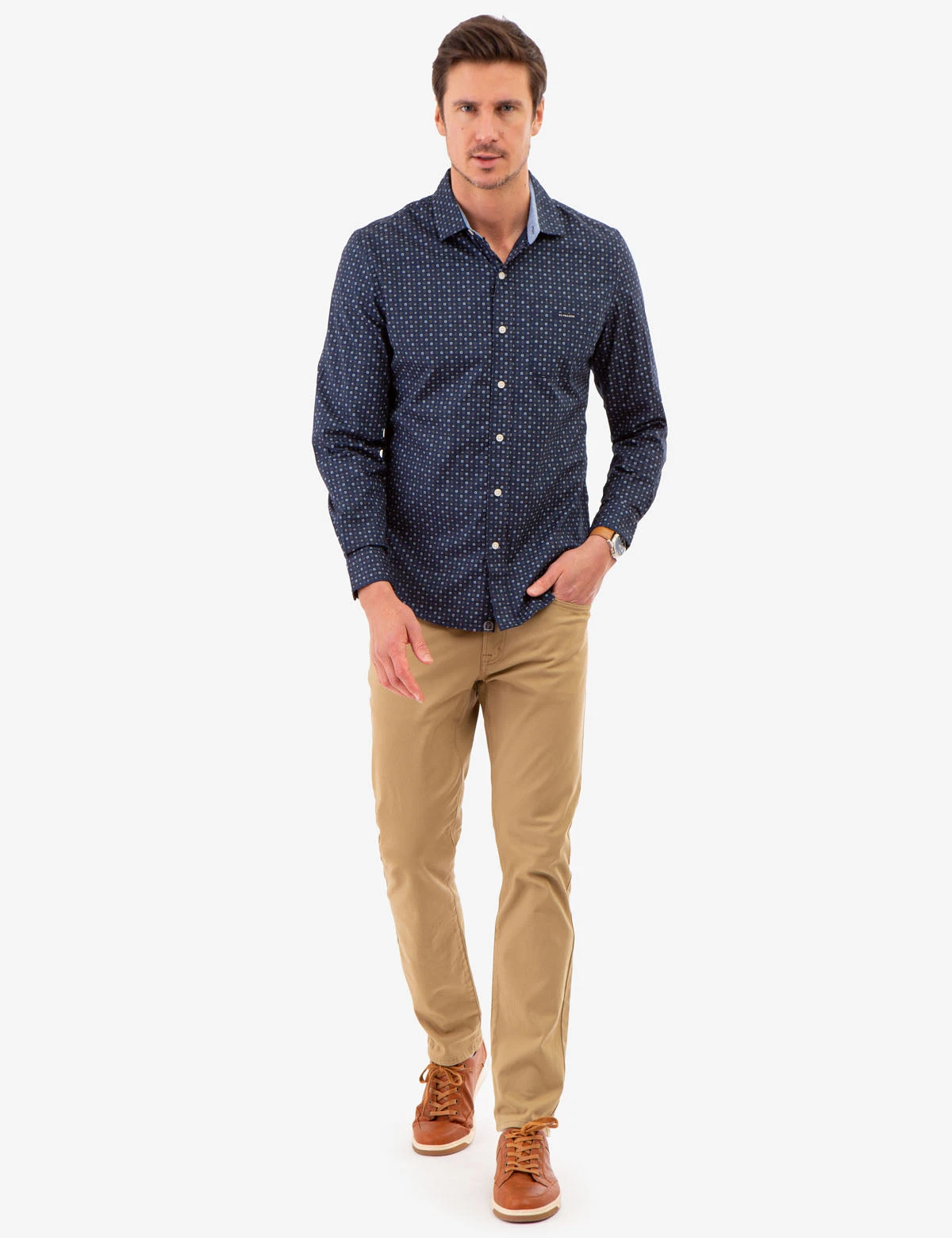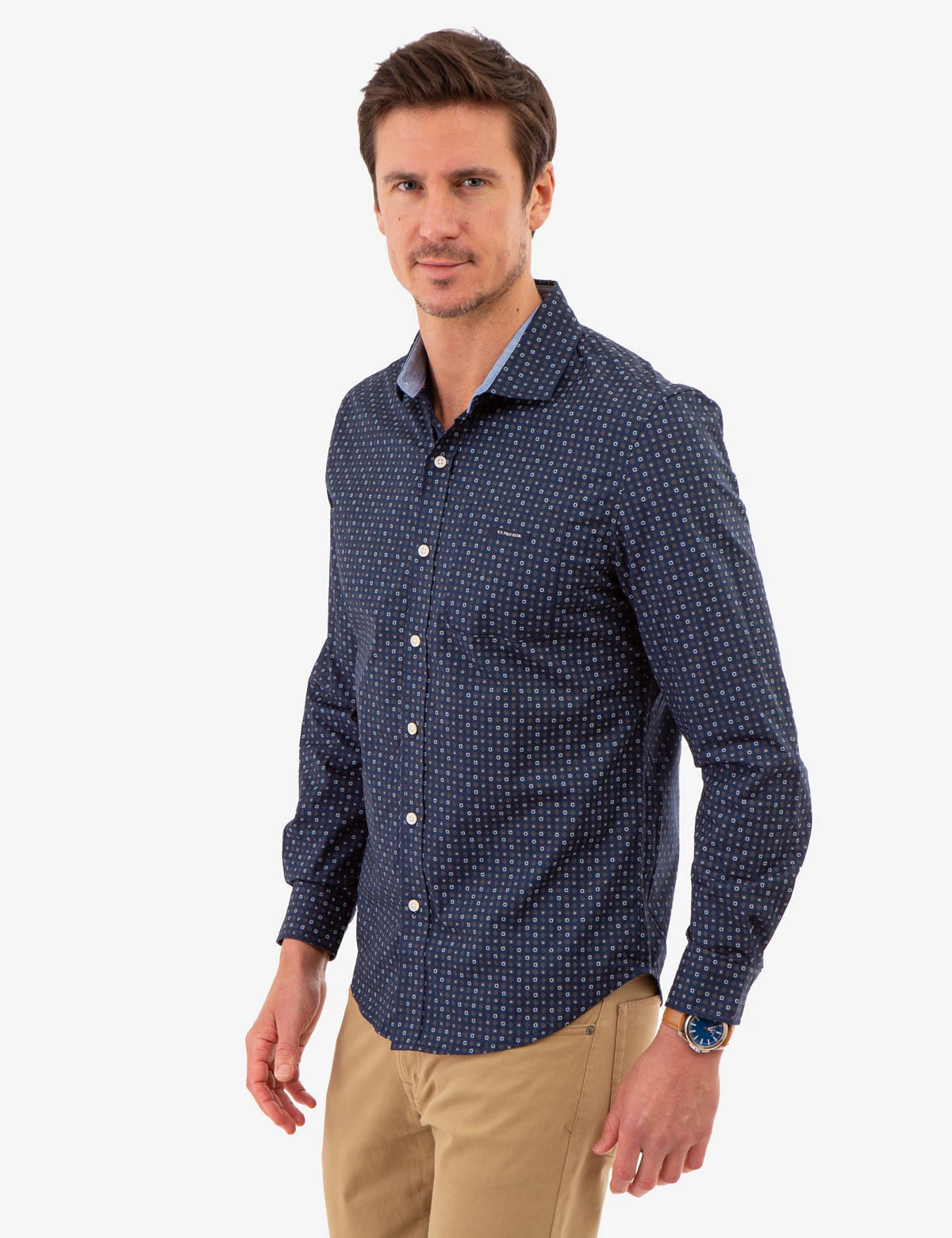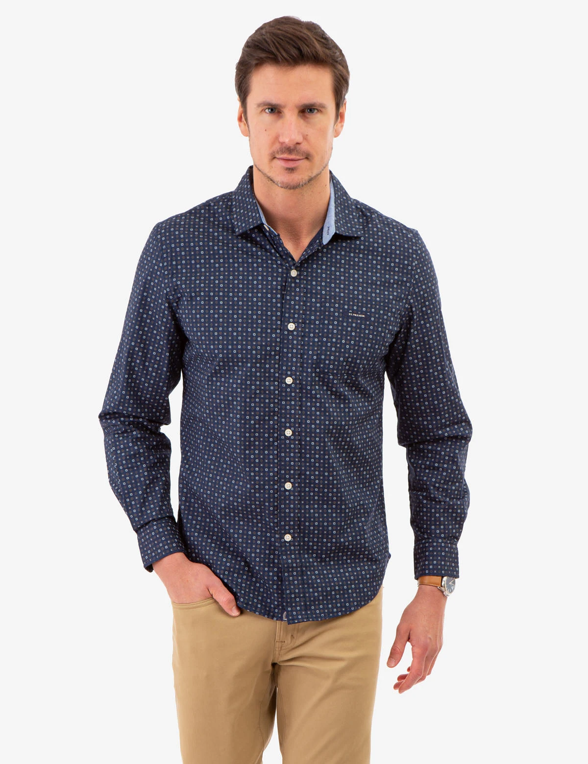 This ALLOVER MULTI GEO PRINT LONG SLEEVE SHIRT is a luxurious, essential staple for every wardrobe. The point collar with front button closure placket offers a polished look, while the long sleeves with button cuffs and patch pocket featuring embossed branding on the chest give the garment a sophisticated edge. Model is wearing a size Medium.Â