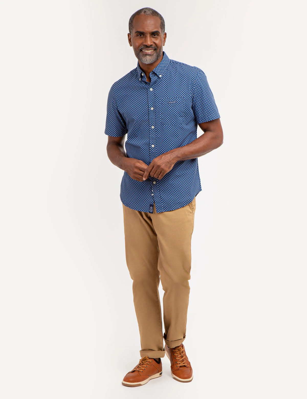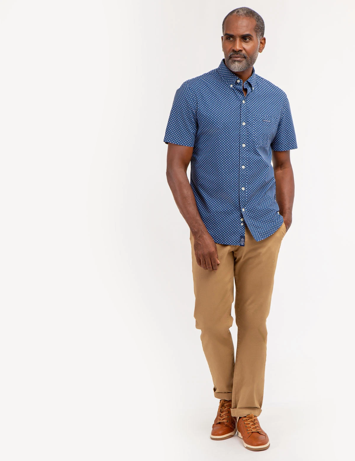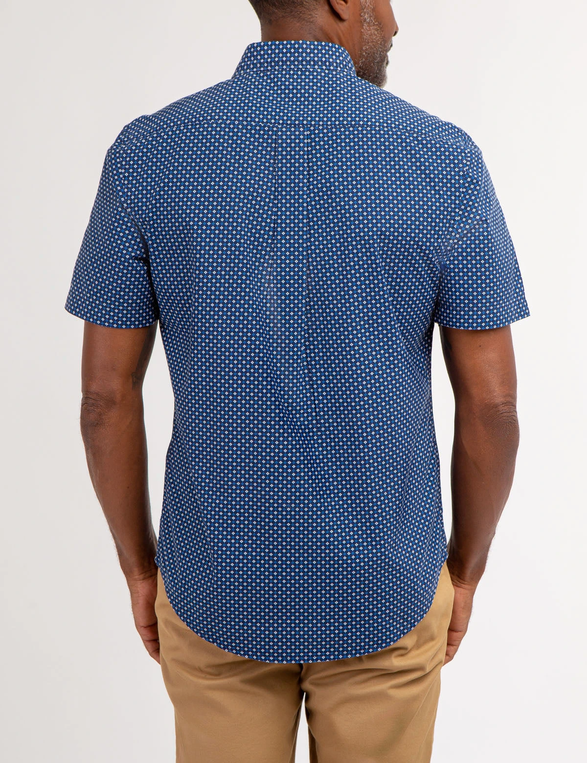 A timeless garment with an exquisite allover diamond pattern, the DIAMOND PRINT SHORT SLEEVE SHIRT WITH POCKET is a luxurious addition to any wardrobe. It features a collared neckline, buttoned closure, curved hemline, and short sleeves for a classic, chic look. Model is wearing a size Medium.Â