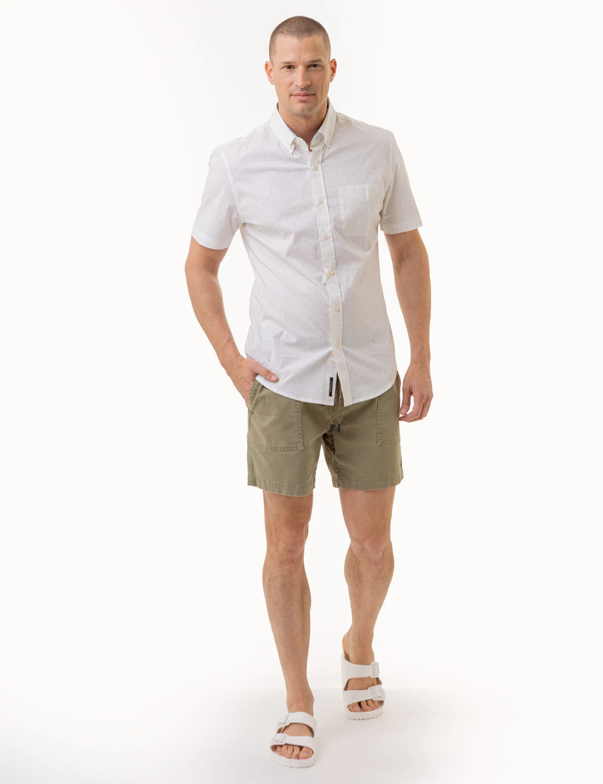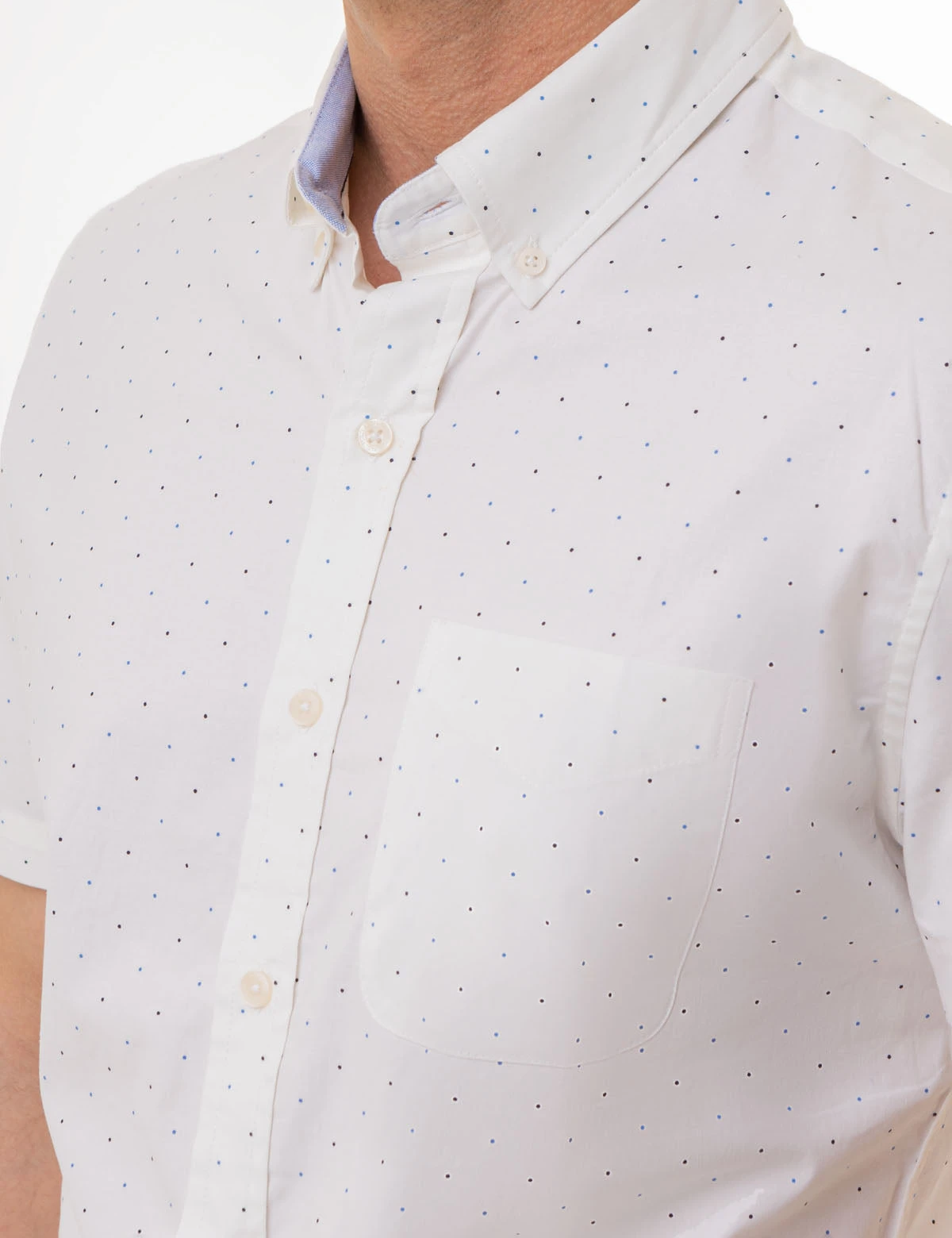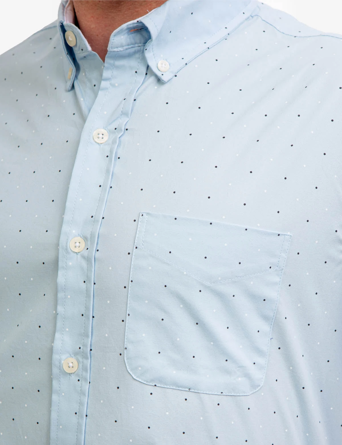 Button up the DOT PRINT POPLIN SHORT SLEEVE SHIRT with a classic collar for a timeless look. Featuring short sleeves and a patch pocket on the upper left front, this garment is adorned with an all-over dot print for a sophisticated edge. Our signature woven label at the bottom of the placket completes the piece. Model is wearing a size medium.Â