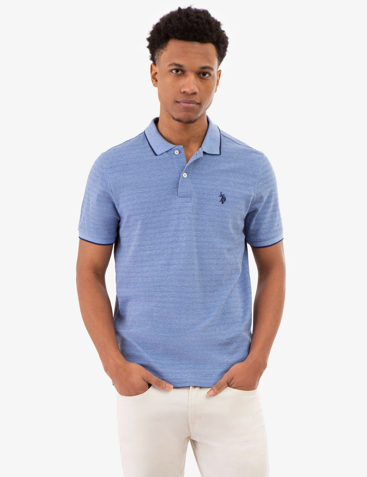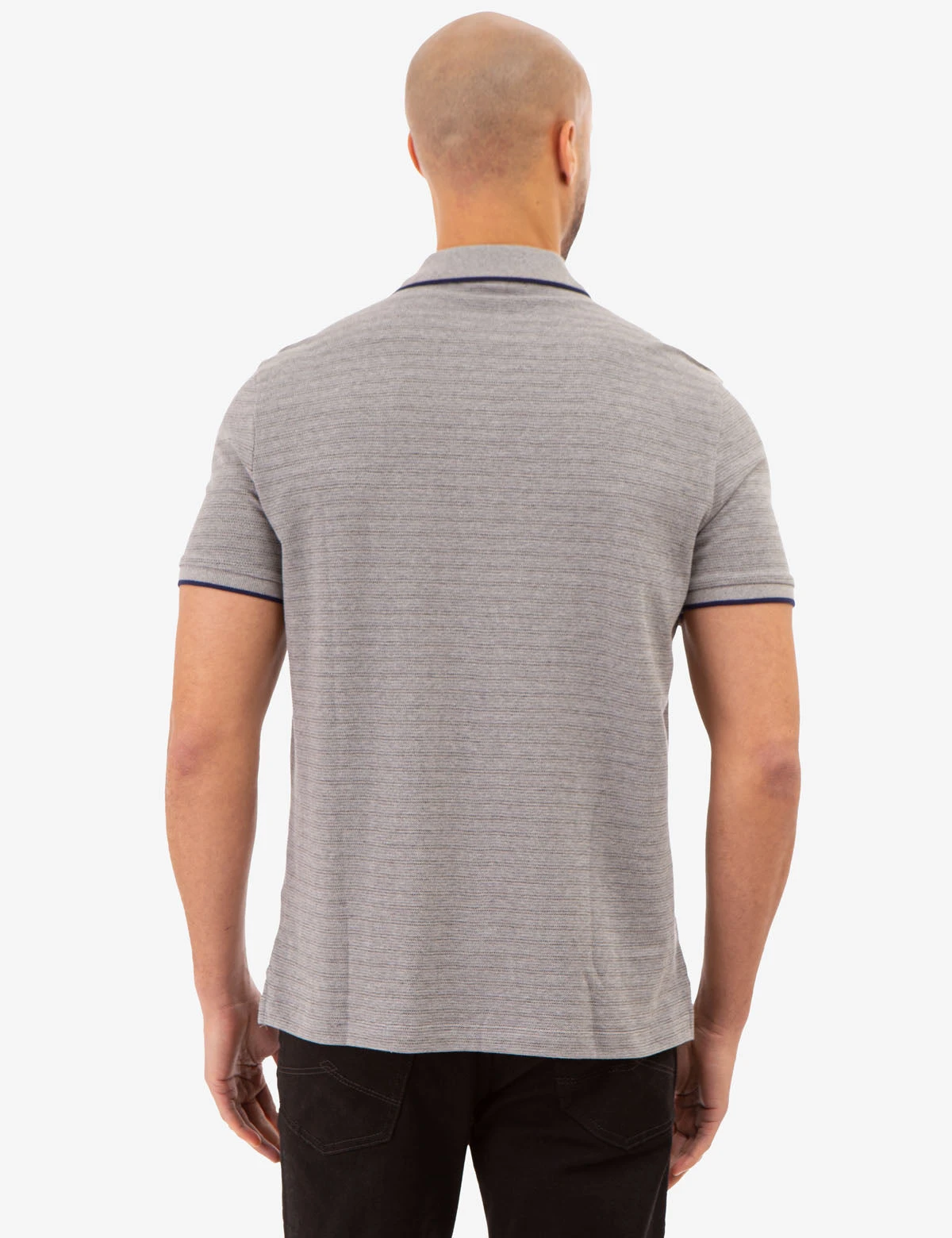 Experience a timeless look with our luxury JACQUARD MARLED STRIPE POLO SHIRT. This style boasts a classically tipped collar with a two-button placket, short, tipped sleeves and an exquisite embroidered logo at the upper front left chest. A light marled stripe design and vents at the hem add subtle allure. Model is wearing a size medium.