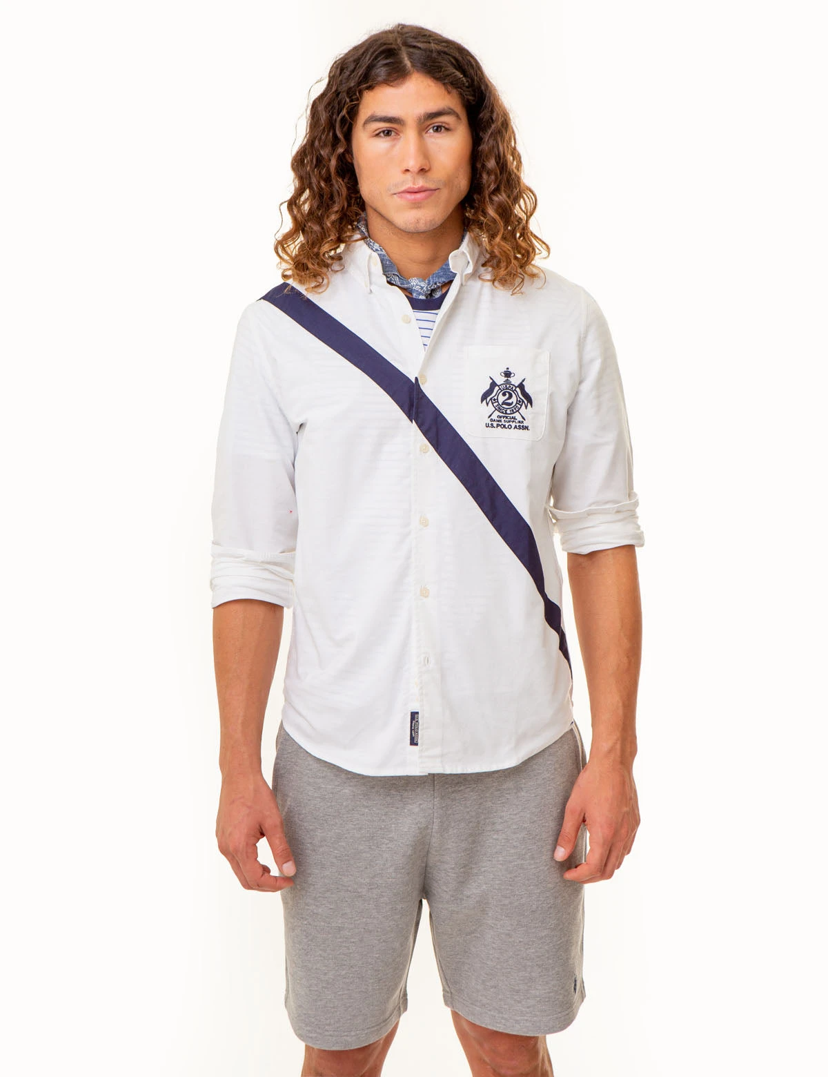 Exuding sophistication, this LONG SLEEVE DIAGONAL SASH OXFORD SHIRT features a stylish chest patch pocket with intricate patch embroidery. Flaunting a classic spread collar and long sleeves with button cuffs, the shirt is secured by a buttoned front closure. This luxe design is capped of with a stylish Diagonal Sash that is sure to elevate your wardrobe. Model is wearing a size Medium.Â