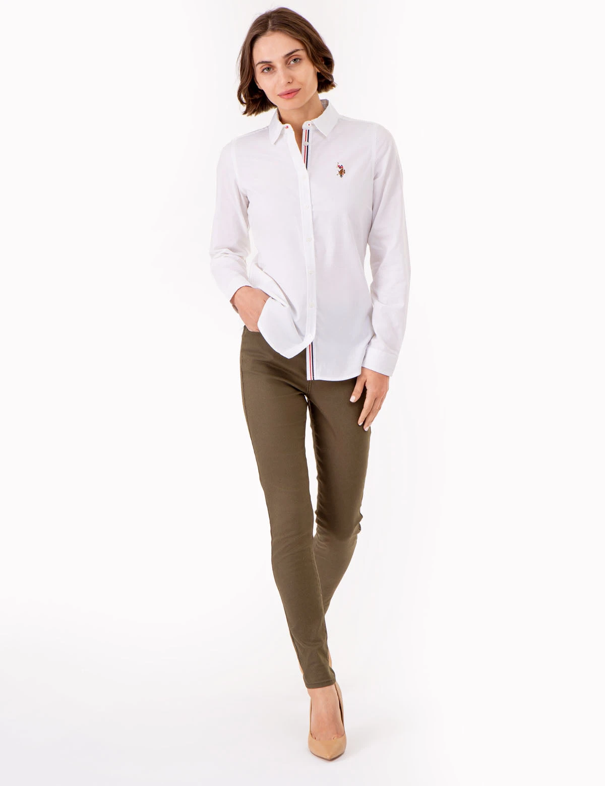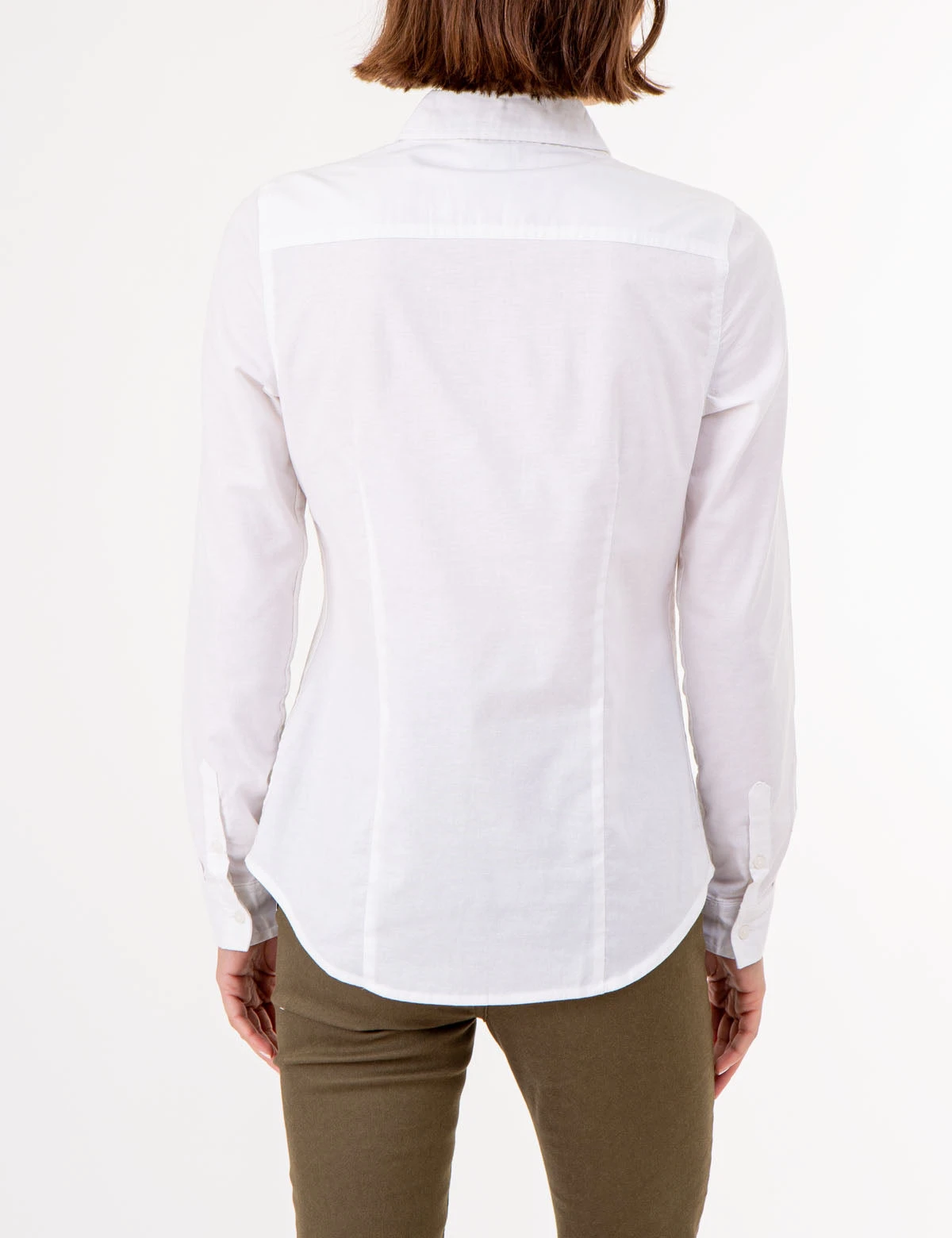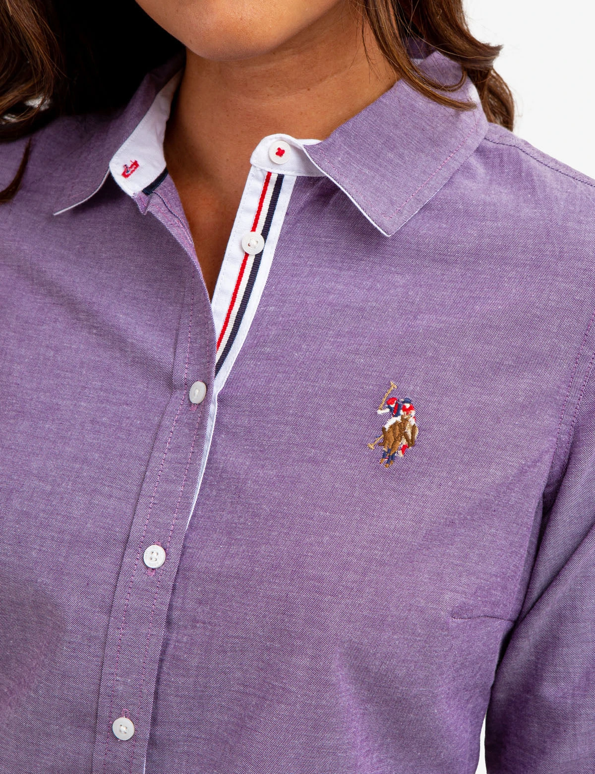 Crafted with traditional style and impeccable quality, our LONG SLEEVE SOLID STRETCH OXFORD SHIRT is a timeless essential. The classic spread collar and long sleeves with button cuffs reflect a timeless aesthetic. This style also features a shirttail hemline and a center front closure with eye catching inner beauty. To complete the look, a multicolor embroidered logo sits upon the upper left chest. Model is wearing size small.