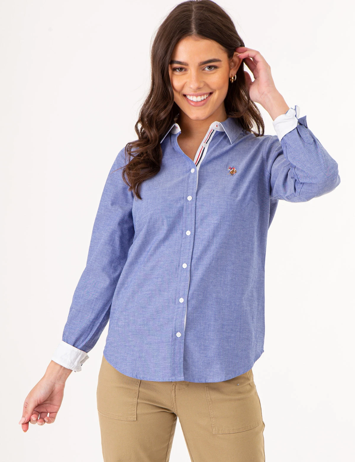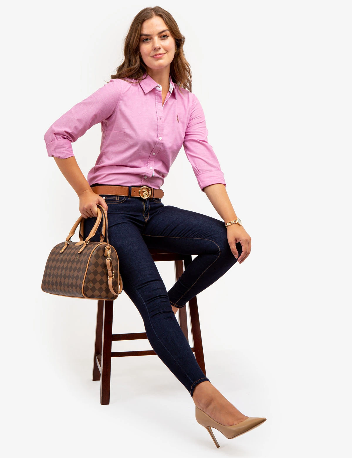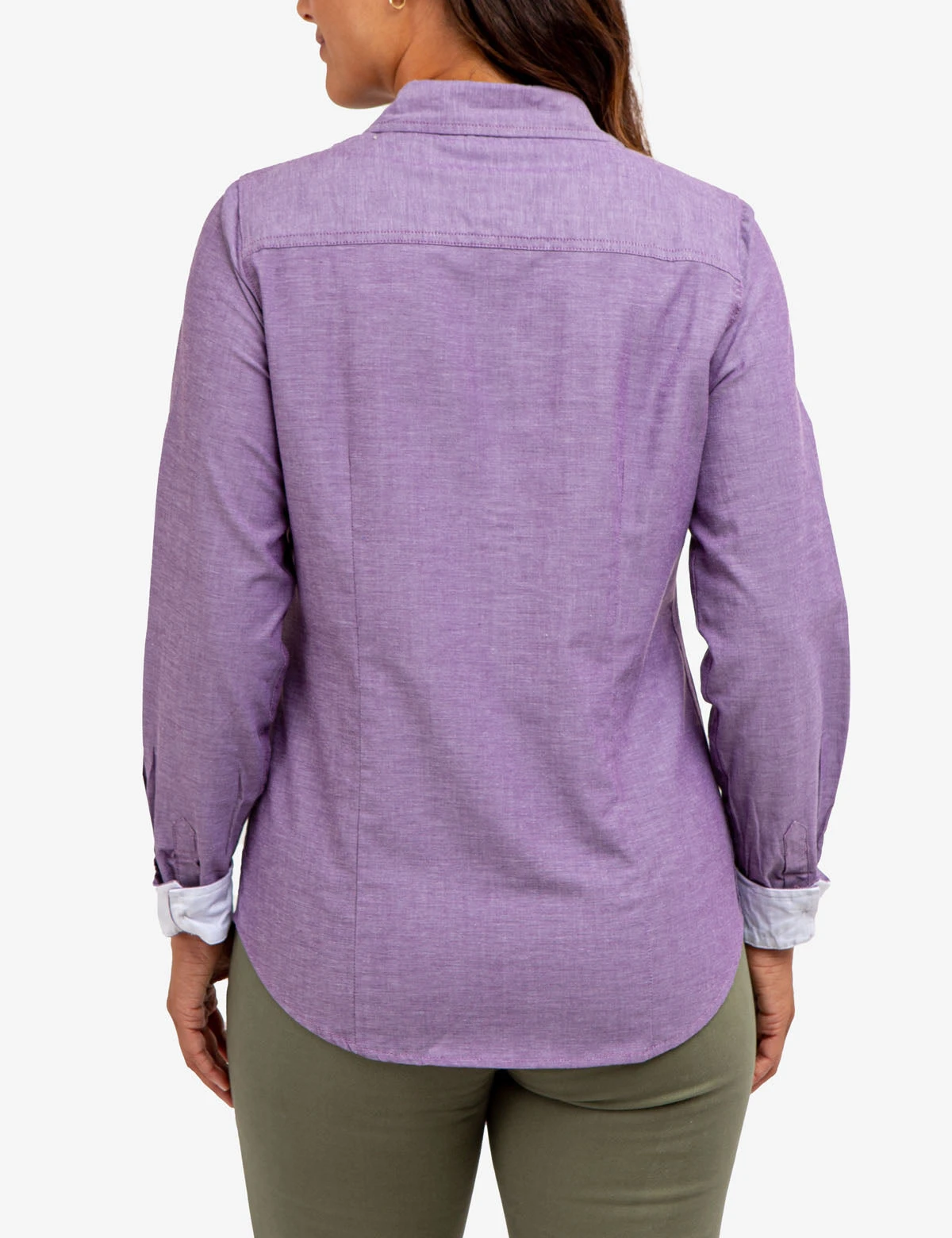 Crafted with traditional style and impeccable quality, our LONG SLEEVE SOLID STRETCH OXFORD SHIRT is a timeless essential. The classic spread collar and long sleeves with button cuffs reflect a timeless aesthetic. This style also features a shirttail hemline and a center front closure with eye catching inner beauty. To complete the look, a multicolor embroidered logo sits upon the upper left chest. Model is wearing size small.