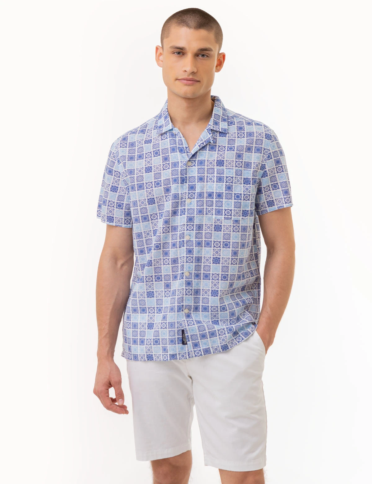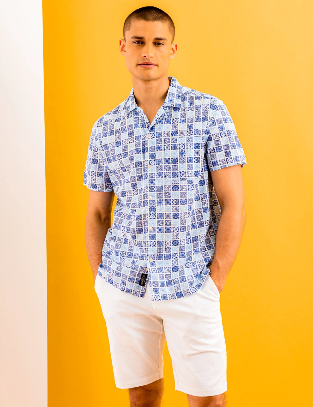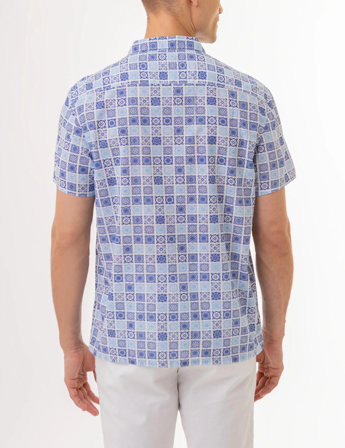 This luxury MEDALLION PRINT WOVEN SHIRT artfully combines classic style with contemporary fashion. The intricate medallion print adds an eye-catching detail, while the collared neck and short sleeves provide an elegant silhouette. An iconic branded patch near the hemline and chest pocket add the finishing touches to this sophisticated look. Model is wearing a size Medium.Â