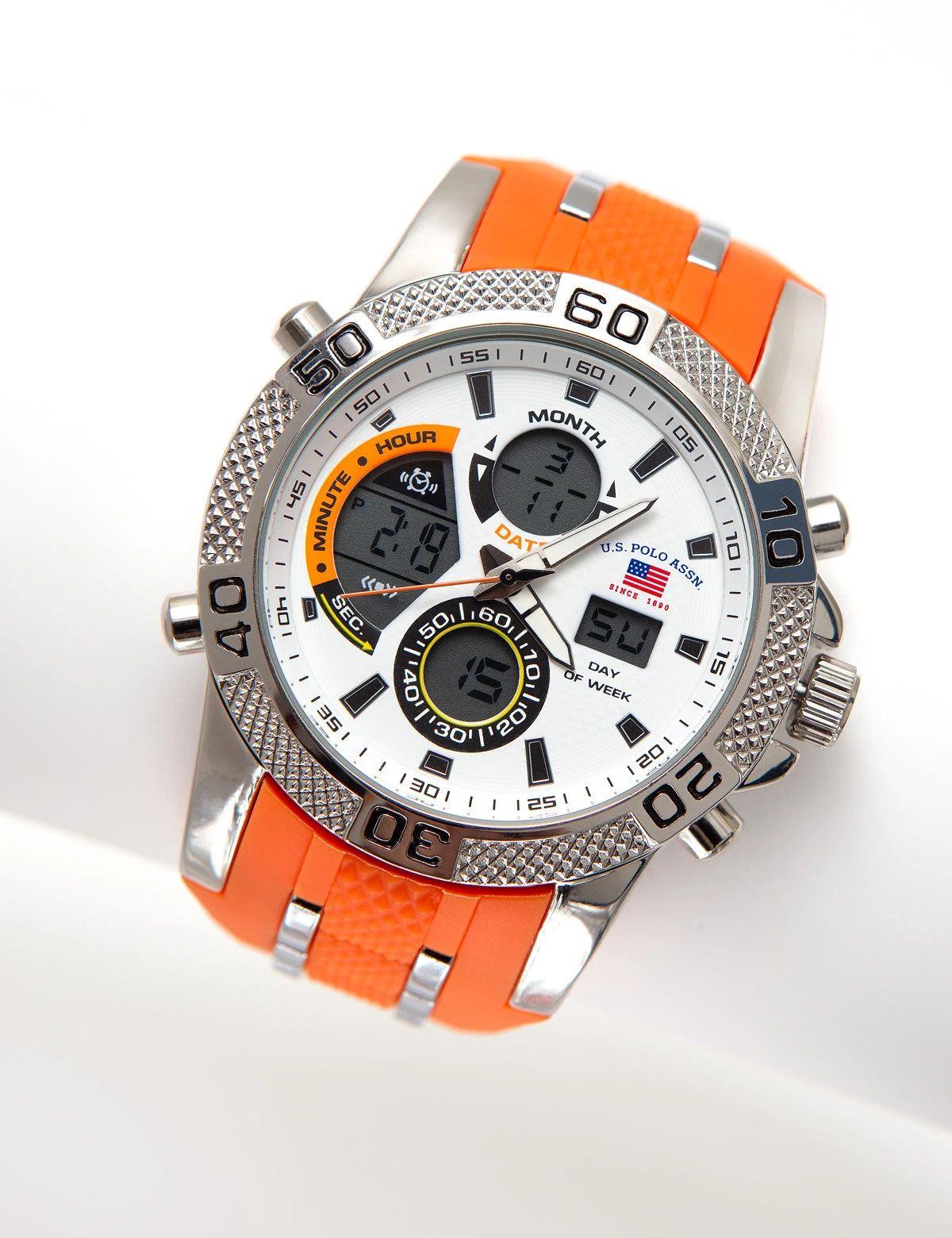 - White sundial with U.S. POLO ASSN. wording and small flag.