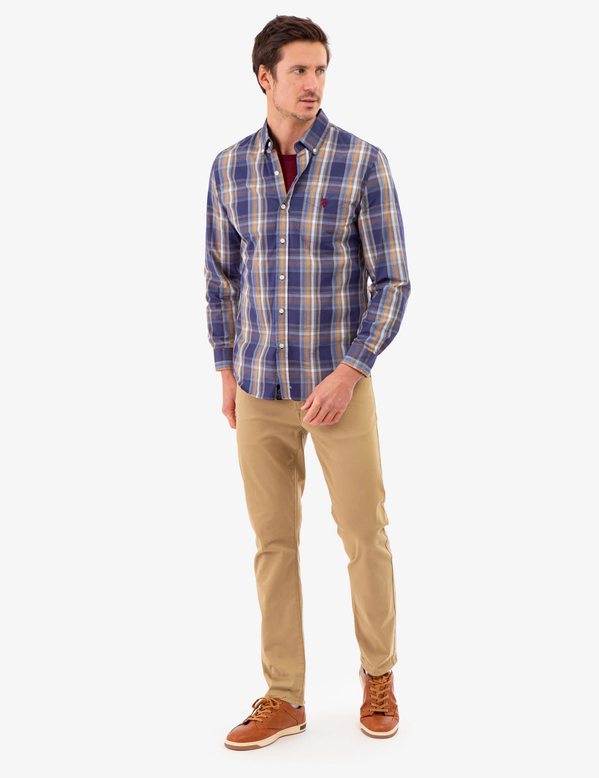 A classic checkered print adorns this PEACHED POPLIN PLAID LONG SLEEVE SHIRT, accented by a buttoned front closure and a curved hem. Featuring long sleeves with buttoned cuffs, it is complete with a patch pocket carrying a signature, contrasting logo for a touch of luxury. Model is wearing a size Medium.