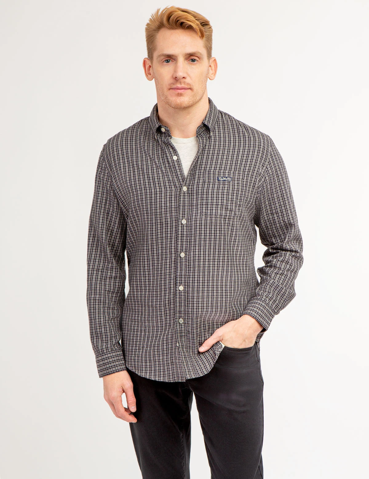 A refined wardrobe staple, our PLAID HEATHERED TWILL LONG SLEEVE SHIRT features a classic plaid print, button front closure, and shirttail hemline. Topping off the look is a branded patch pocket on the chest, adding a touch of luxury to any look. Model is wearing a size Medium.Â