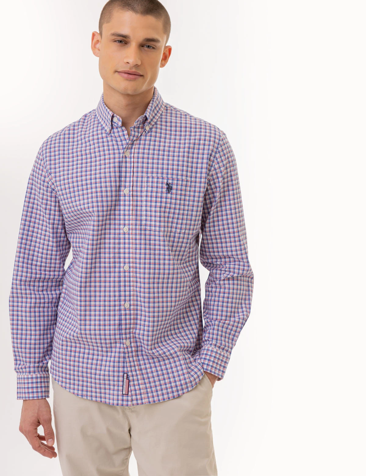 Crafted with classic sophistication, the PLAID LONG SLEEVE WOVEN SHIRT WITH POCKET emanates refinement. Its iconic pointed collar and patch pocket adorned with a brand logo couples with an allover plaid pattern and branded tag near the hem to ensure an elegance befitting of any premium wardrobe. Model is wearing a size medium.Â
