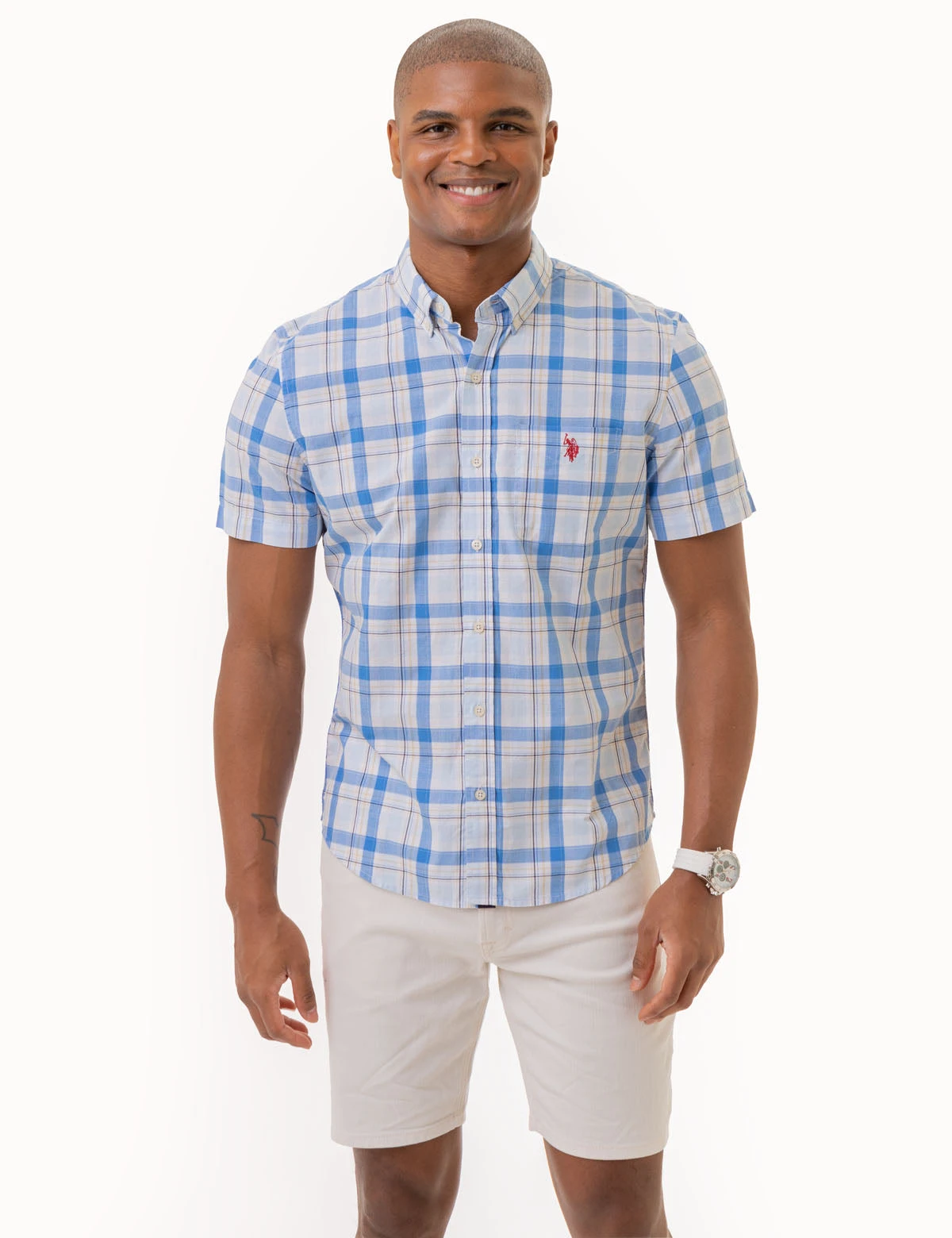 Don the iconic silhouette of the PLAID SHORT SLEEVE POPLIN SHIRT WITH POCKET, featuring a signature logo over the left chest and stylish patch pocket. Finished with a shirttail hemline, short sleeves, and a fold-over collar, this piece exudes sophisticated elegance. Model is wearing a size Medium.