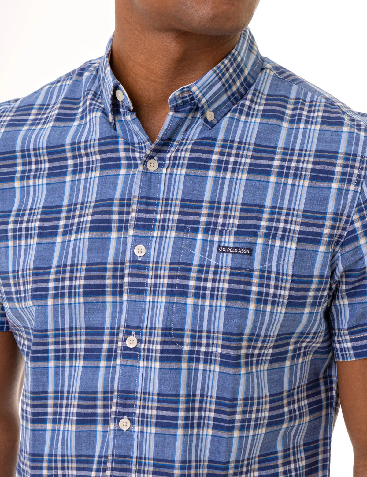 Elevate your off-duty style with our PLAID SLUB POPLIN SHORT SLEEVE SHIRT. Boasting a buttoned closure and a branded patch over the left chest patch pocket, this short-sleeved top features a curved hemline and an allover plaid print for the perfect finishing touch. Model is wearing a size Medium.Â