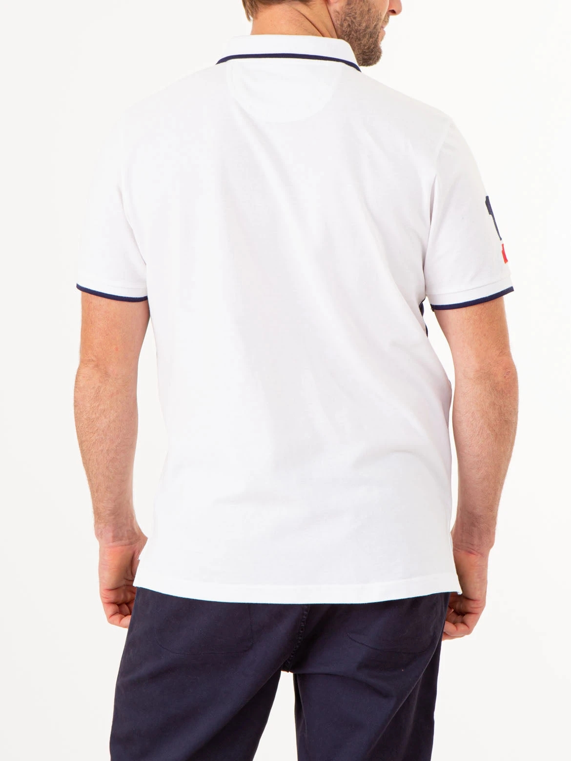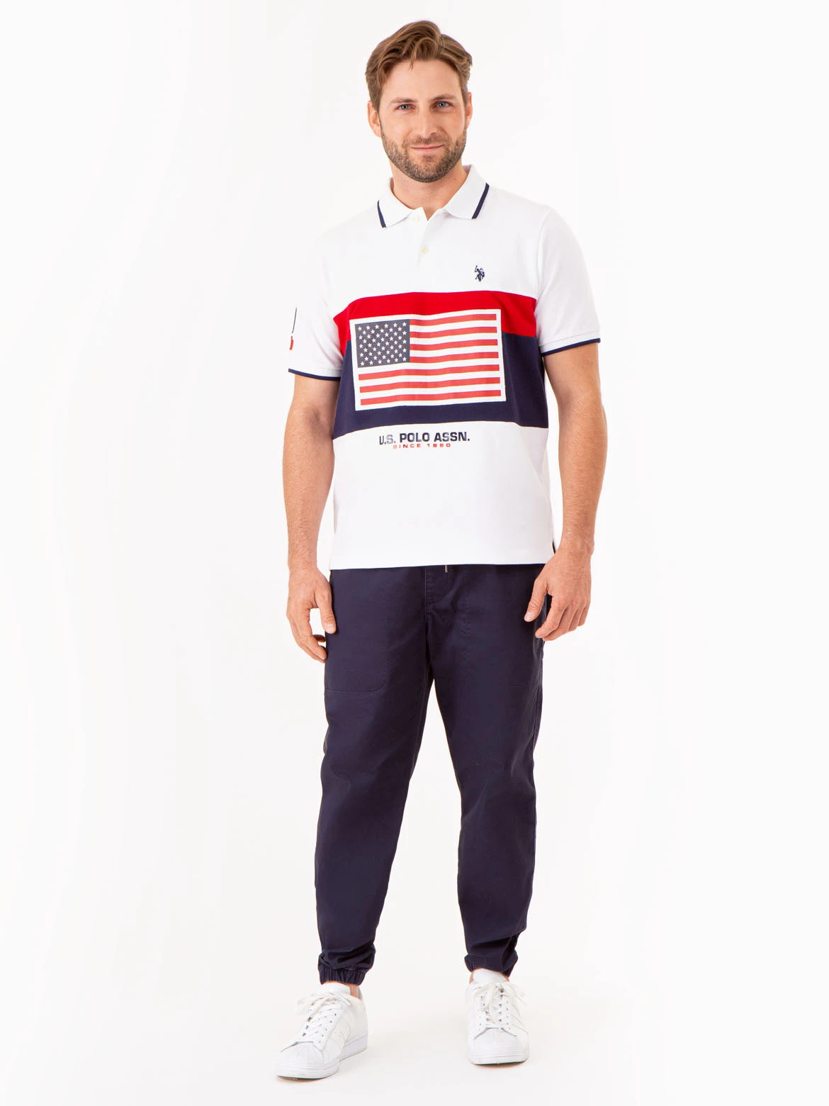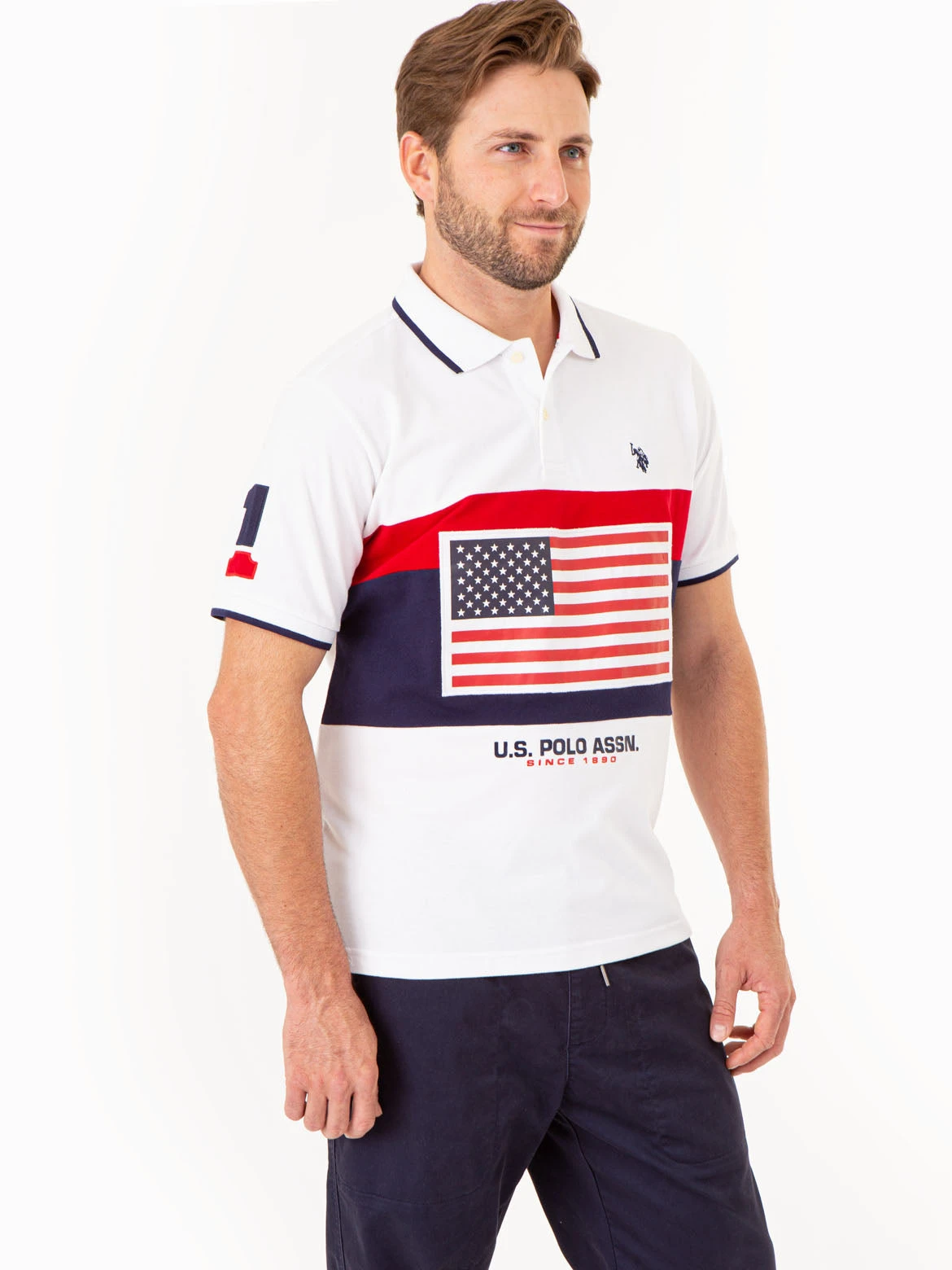 This PRINTED FLAG COLORBLOCK PIQUE POLO SHIRT exudes style and originality. Crafted with a classic tipped collar and tipped short sleeves, this garment is adorned with a prestigious embroidered logo on the upper front left and an elegant embroidered number one on the right sleeve. Its daring colorblock design with a printed flag at the center completes its bold and sophisticated look. Model is wearing a size medium.