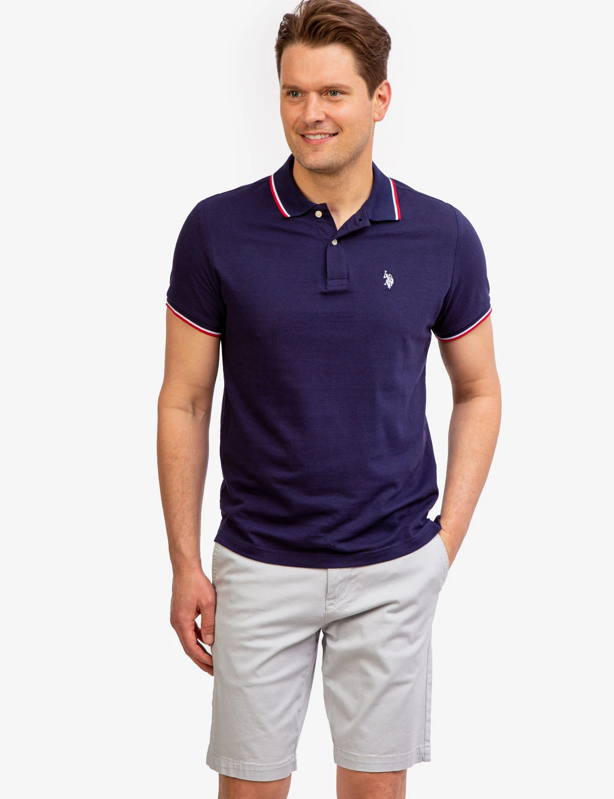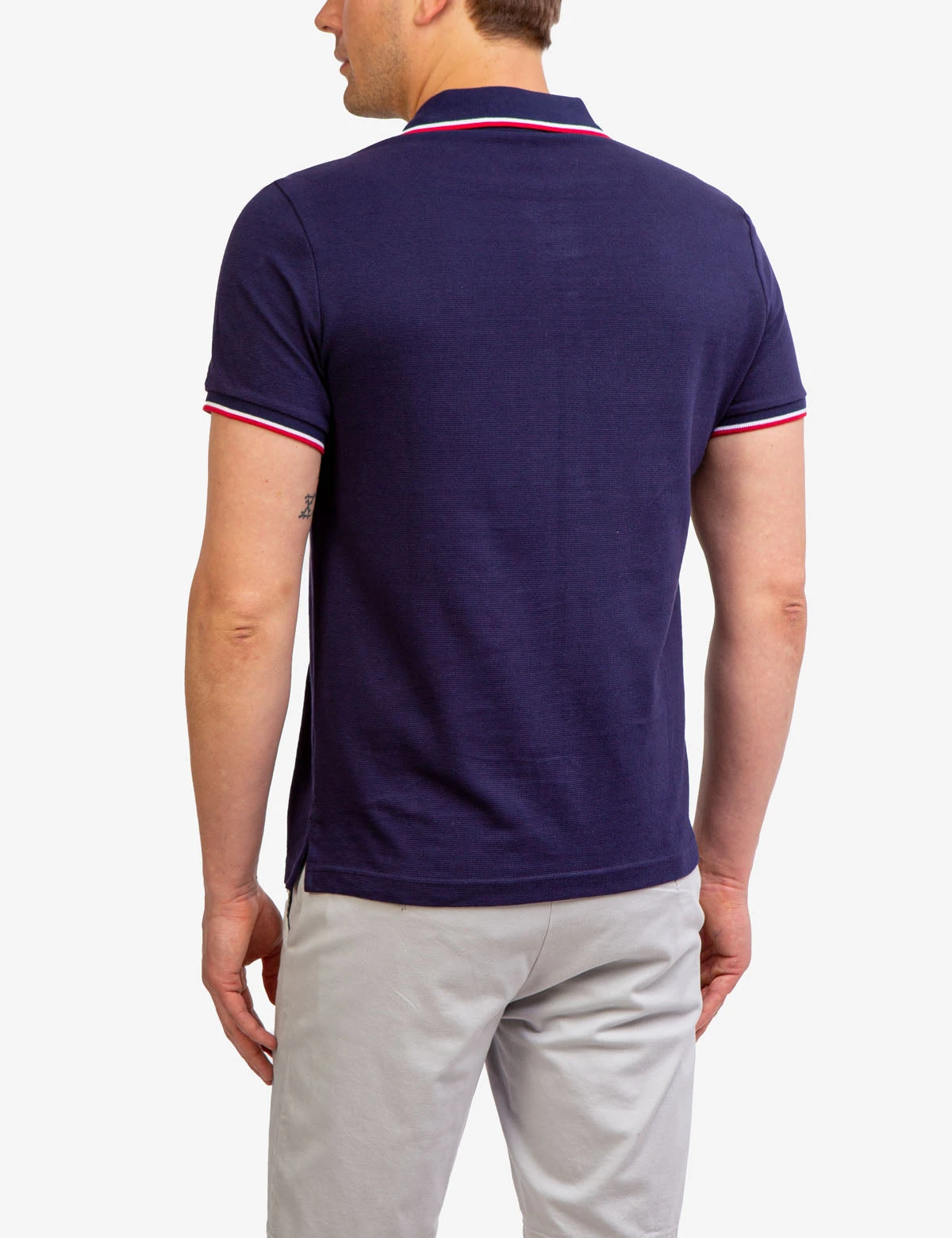Our TIPPED OTTOMAN PIQUE POLO SHIRT exudes a timeless sophistication, elevated by the two-button tipped collar and short, tipped sleeves. Its slim fit is complemented by side vents, while a contrast embroidered logo adorns the upper left front, lending this piece its signature luxury touch. Model is wearing a size medium.