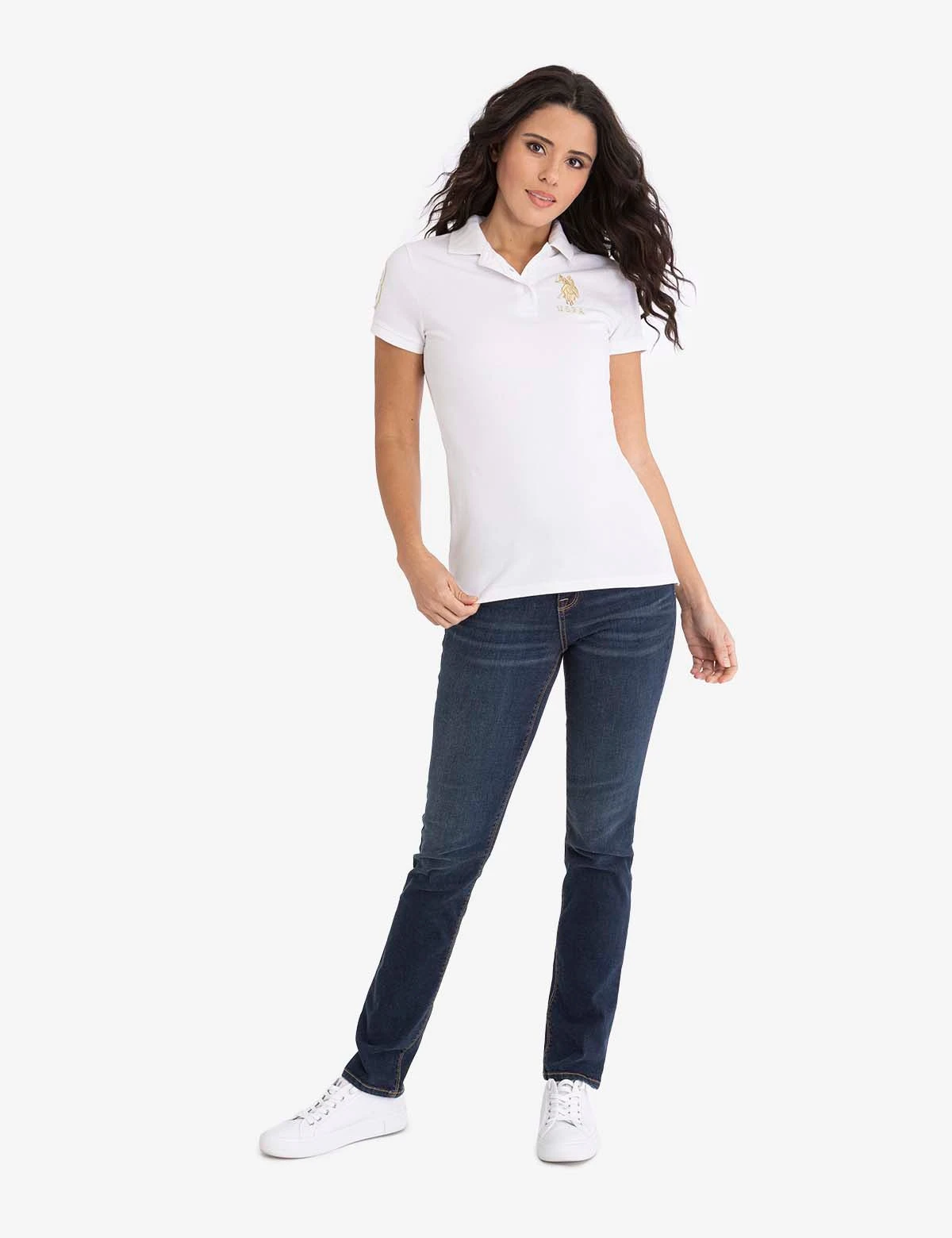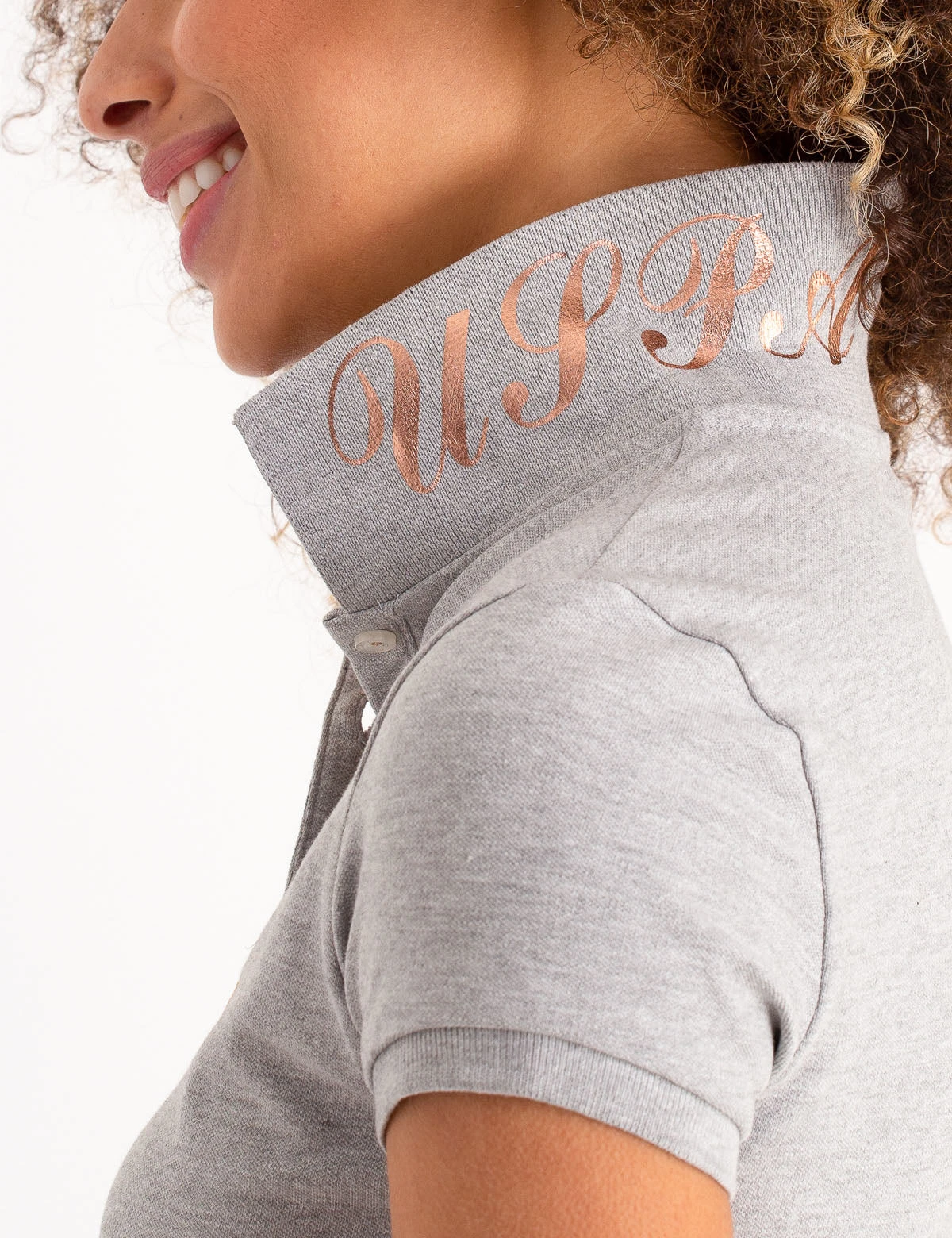 Our USPA METALLIC PRINT POLO SHIRT combines the timelessness of a classic polo shirt silhouette with a contemporary edge. Its features a three-button front placket, straight hemline, side vents, a large metallic embroidered logo at the top front right, an embroidered “three” on the side sleeve, and a printed metallic wordmark under the collar. Timeless yet modern, this garment is both sophisticated and exclusive. Model is wearing a size small.